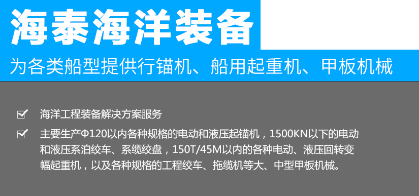 江蘇海泰海洋裝備有限公司位于素稱“銀杏之鄉(xiāng)”的泰興市,2018年投資建設(shè),至今已經(jīng)成為產(chǎn)品研發(fā)、生產(chǎn)制造,調(diào)試服務(wù)為一體的設(shè)備配套企業(yè)。公司從事海洋裝備(設(shè)備)及配件的制造、設(shè)計(jì)、安裝,維修;船用錨機(jī)、絞車(chē)、起重機(jī)、舾裝件、電氣設(shè)備、環(huán)保設(shè)備設(shè)計(jì)、制造。公司成立以來(lái),就與中國(guó)船舶工業(yè)集團(tuán)公司第701所、702所、704所、708所、上海船舶研究設(shè)計(jì)院等多家船舶科研院所建立了技術(shù)合作關(guān)系,產(chǎn)品應(yīng)用于......